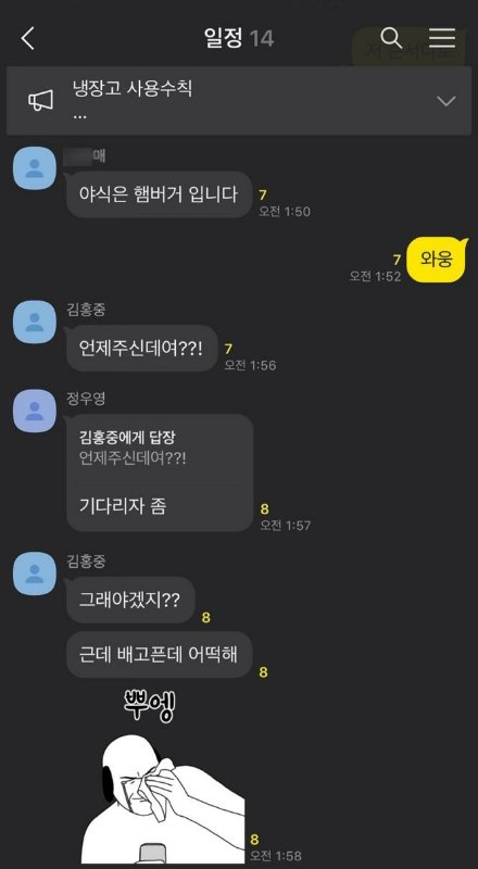 냉장고 사용수칙 공지로 올라가있는 것도 댕웃김 먹는거에 진심인 사람들.... ㅋㅋㅋㅋ 저거 박성화가 해놨을 확률100%