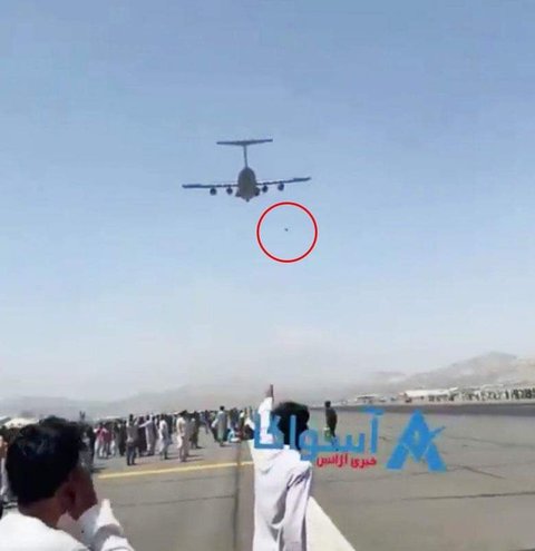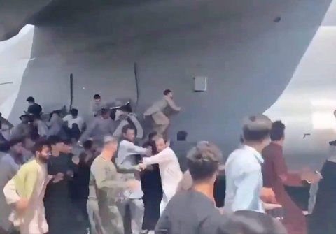 반 탈레반 시민들이 공항 담장을 넘어 활주로에 눌러앉아 아무 비행기나 붙잡으려 하는 모습이야
