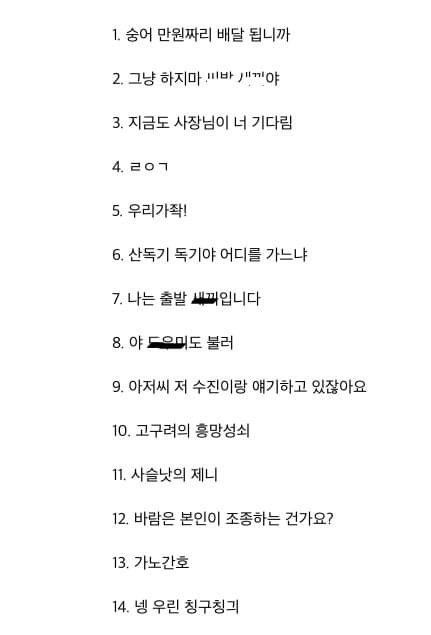 3.지금도 사장님이 너 기다림- 자기 카페에 공부하러 갈때마다 10만원씩 쓰는데 민폐냐고 글 올리니까 댓글에 10만원은 인정 이라면서 지금도 사장님이 너 기다린다고 댓글담 5.우리 가좍- 가족 친척끼리 모여서 식사하는데 쓰니가 실수로 은쟁반으로 삼촌 머리 내려쳐서 우리가족이~라고 해야할걸 우리가좍!!!일케 됨 8.야 도우미도 불러- 노래방인가 술집에서 알바하는 글쓴이가 자기 알바하는 가게에 남자애들이 옴 걔네가 도우미도 불러 이래서 성매매하는 여자 부르라는 건가 이랬는데 친구 이름이 도움이였음 9.아저씨 저 수진이랑 이야기 하고 있잖아요- 어떤 남돌 팬싸때 팬이 시간 다되서 넘어가라고 경호원이 그랬는데 그 남돌이 아저씨 저 수진이랑 이야기 하고 있잖아요 함 13.가노간호- 간호학과 학생인데 본인 과에 유노윤호 닮은에 별명이 가노간호 이렇게는 안다 ^.^