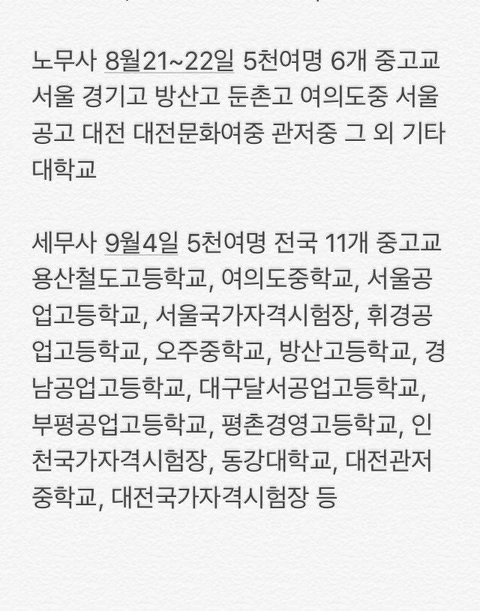 이번주 8/21일토요일에 약 4만3천명의 경찰공무원 수험생과 5천명의 노무사 수험생이, 그리고 이 주 뒤에는 5천명의 세무사 수험생이 우리 아이들이 다니는 ‘중고등학교’를 이용하여 시험을 본다고 합니다.
