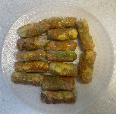 입이 심심해서 당근 애호박 계란 속을 만들어 라이스페이퍼에 싸서 살짝 튀긴건데 생각보다 괜찮더라구요 느끼할땐 스리라차소스로