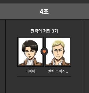 아니 그냥 작가 공인 이상형도 서로 그자체야 애초에 하지메가 리바이 처음부터 비엘 노리고 만든 캐라 그랬고 그냥 리바이 미국 성우도 리바이는 엘빈 말고는 아무도 사랑하지 않을 것 같다고 해 백야를 백합게임에서 따오고 ㅋㅋㅋ 서사는 너무 많아서 말도 못함 ;
