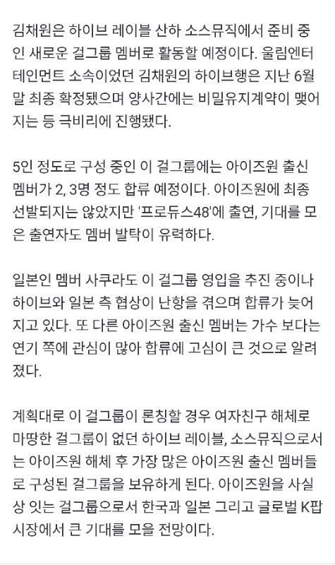 근데 오디션만 5년 했는데 그동안 뭘 했길래 멤버픽스도 안되있고 지네 연생만으로는 얼마나 자신이 없으면 얼마전 해체한 주작돌 경력직을 주어오며, 그게 아니라면 현역을 신인그룹에 영입할셈인 이유는? 해체경력직 현역을 둘이나 영입논의중에 프나도 영입할거였음 논란없이 나름 무난노선 타고있는 여친은 왜 그렇게 갑작스럽게 해체시킨건지?