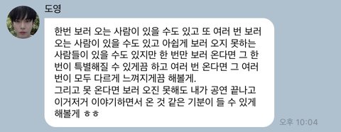 진짜 너무 고맙고… 그냥 이 배려심이 너무 감동임,, 말을 너무 예쁘게 하고 상대방을 생각해주는 마음이 여실히 드러나서 그저 김도영이 하는 공연의 모든 순간들을 사랑하고 응원하고 싶음 진짜 고마워 도영아 25일에 보러갈게 사랑해