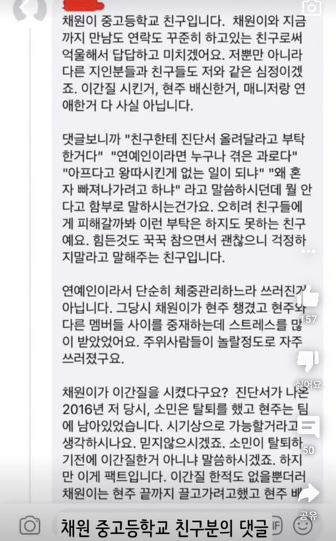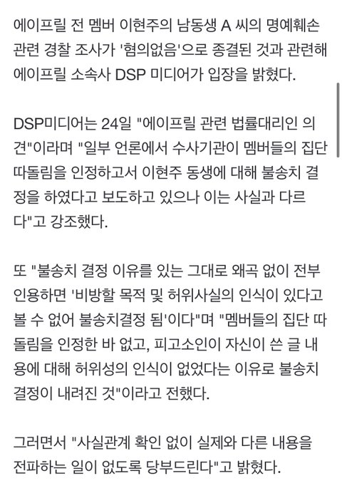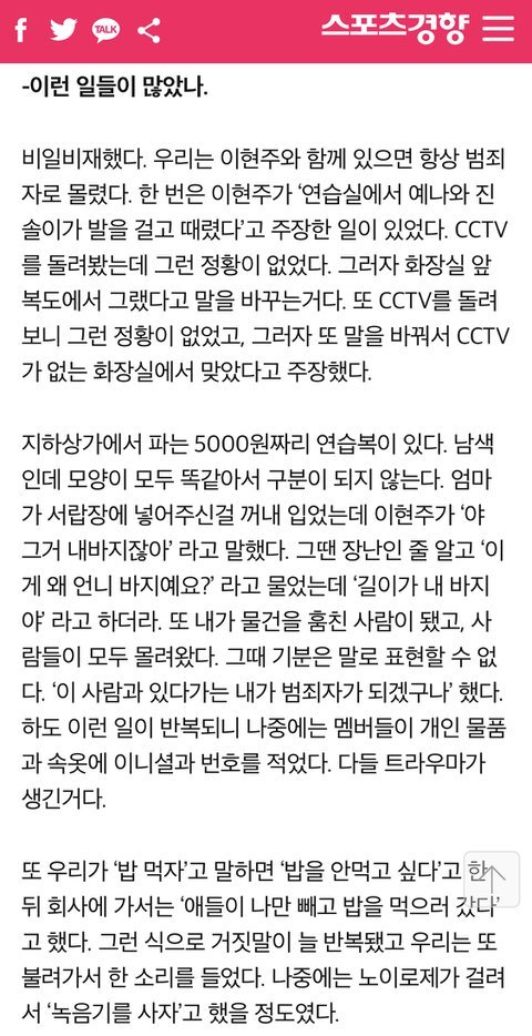 경찰 조사에서 이현주 동생인가? 무혐의 받았다는 것도 본 것 같은데, 그게 그 모든 말이 진실이다라고 받아들여지면 안되는 것 같아. 그 말이 혐의가 없다는건 그것이 거짓이라고 받아들여지기가 불충분하다는 말이지만, 동시에 그 말이 진실이라고 받아들여질 수도 없다는 말이잖아. 그리고 이현주 동창생 증언도 봤는데, 채원이나 다른 멤버들의 주변 사람들도 많이들 증언 했어. 단지 그건 자극적이지 않기 때문에 공론화가 되지 않고 묻힌 것이지.