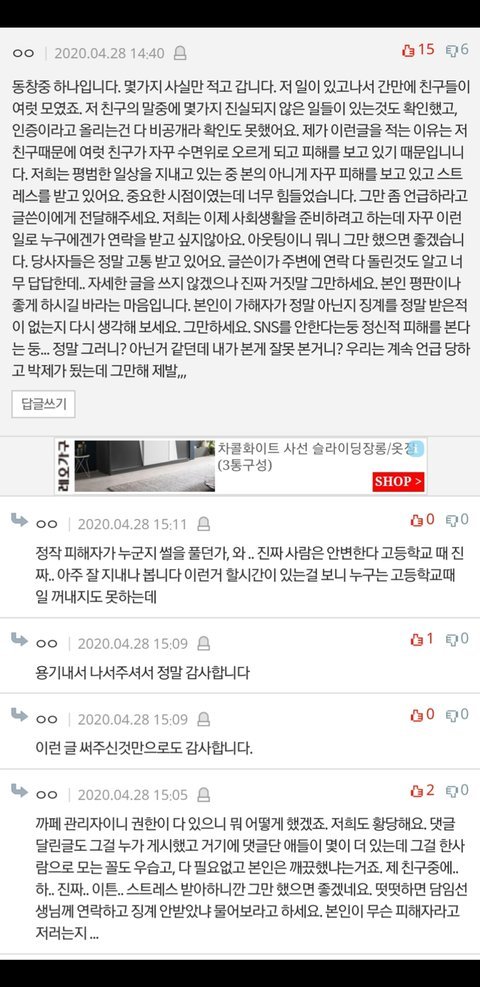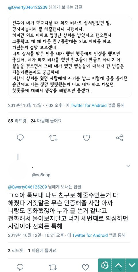 막상 그 여자분은 학창시절 동창으로부터 너는 왜 남들 외모비하 하고 다녔냐고 트위터로 공개저격당한 후 개인사정이니 개인적으로 해결한다고 트위터 닫음