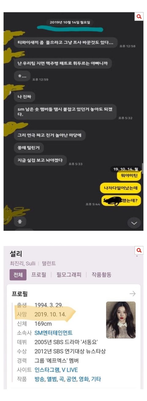 얼마 후 10월 14일 설리가 하늘나라로 떠나 나라가 뒤집힌 바로 그날 당일 티와이새끼 겁좀 줬다고 제보자랑 낄낄 거림