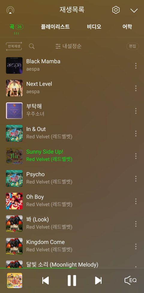 레드벨벳은 사실 다 좋아해서 다 듣지만 그 중에서 In & Out, Sunny side up! , Psycho, Oh boy, 봐, Kingdom come, 달빛소리