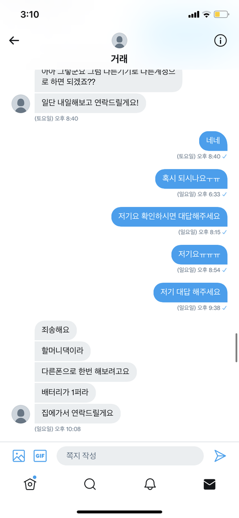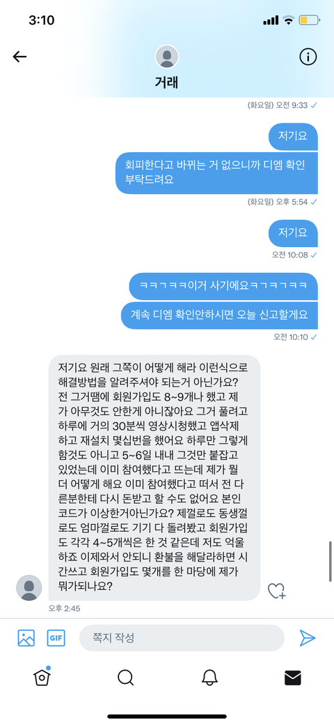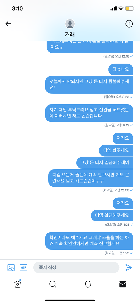 내가 틱톡 추천인을 해주는 사람한테 3씩 주고있는데 이 사람이 불안하다고 선입금을 해달라는고야 그래서 안된다ㅏ고 했다가 믿어달라고 해서 해줬는데 계속 오류가 떠서 입력이 안되는거야 그리고 ㅇㅈㄹ남