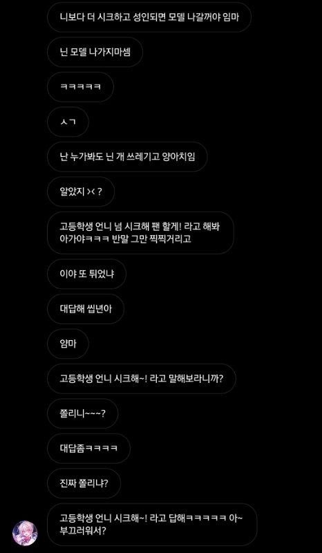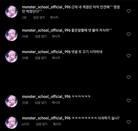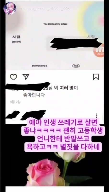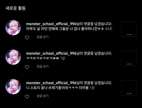 안녕하세요 저는 학생입니다 저의 부탁을 들어주실수 있으신가요? 저는 지금 인스타그램이라는 플랫폼에서 한 사람에게 인신공격을 당하는 중입니다 저는 물론, 저의 친구들까지 공격을 하며 협박과 비슷한 말투들로 엄청나게 쏘아붙이더라구요 저 좀 도와주세요 하루종일 엄청나게 기분이 안좋은 어구들로 저에게 다이렉트 메시지를 보냅니다 제발 이 사람 좀 신고해주세요 저절로 인상 찌푸려지는 패드립과 협박, 욕설들이 저와 제 친구들을 괴롭힙니다 용기내어 이 게시판에 써보는겁니다 제가 이 게시판이 적절하게 도움을 요청할수있는 게시판인지는 잘 모르겠지만 대중들에게 가장 쉽게 신고를 부탁하기엔 가장 수월한 방법이라고 생각합니다 단지 어린 아이들의 싸움이라 생각하는 분도 계실거라 생각합니다 물론 저의 나이도 생각보단 어리지요 하지만 저는 제 친구들까지 당하는 모습을 보고 싶지는 않습니다 여러분 monster_school_official_996 이 계정을 신고해주세요 부탁입니다 그리고 저 계정을 신고할때 저 피드의 스토리를 조회하지 마세요 바로 차단 당합니다