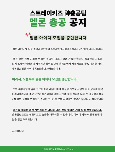 2. 근데 멜론이 8월9일자로 차트 개편을 했어 그래서 본인 외 타인의 아이디 접근이 어려워졌고 타돌분들은 멜론 총공을 아예 안하는 분위기야 근데 총공팀에서는 여러 문제로 각자 다운을 못하는 사람이 많고 단시간에 많이 다운 받아야 순위 올리기에 좋아서 무리가 되지 않는 선에서 아이디 기부를 받았어