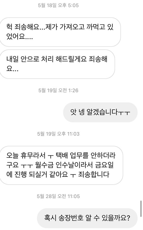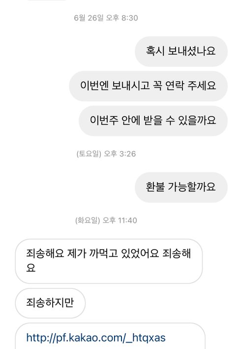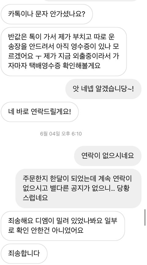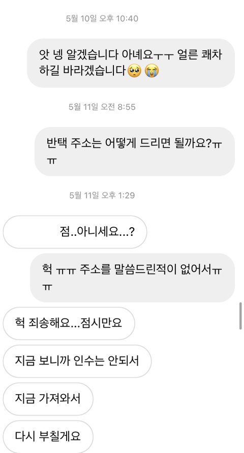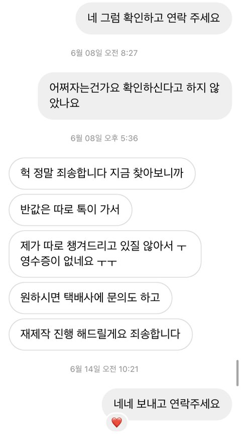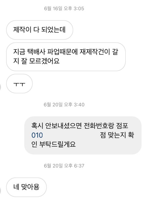 -> 착각하셔서 다시 보내주신다고 함 -> 다시 보내주셨다고 했는데 반택인데도 카톡 아무것도 안오길래 이상한 채로 있다가 계속 기다려도 안오길래 여쭤봄 -> 다시 재제작해서 보내주신다고 하심 -> 이번엔 꼭 주소랑 전화번호 확인해달라고 함