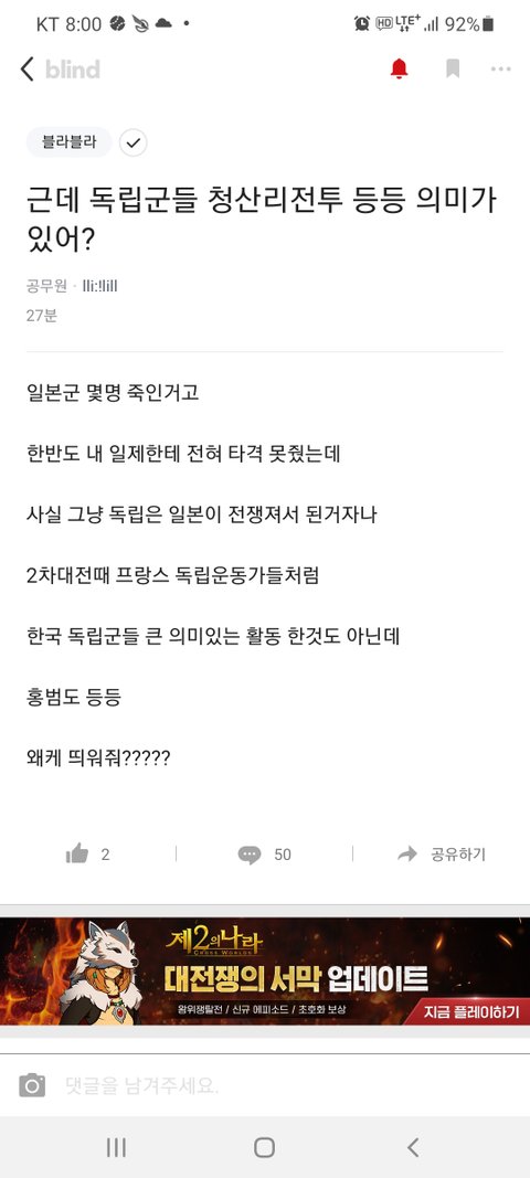 블라인드에 올라온 공무원의 역사인식