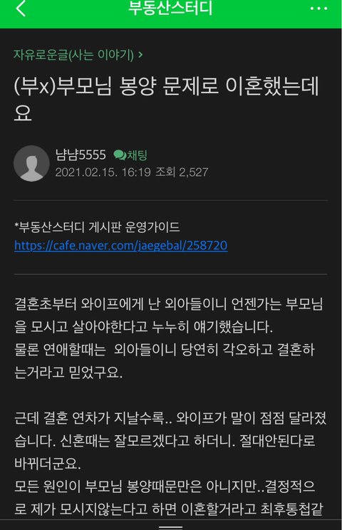 모든 원인이 부모님 봉양때문만은 아니지만..결정적으로 제가 모시지않는다고 하면 이혼할거라고 최후통첩같이 내려버리게 되었고.