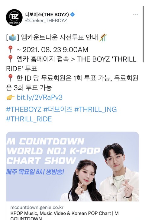 쇼챔, 인가, 엠카 투표 안 한 더비 있으면 후딱 하구 오자 ‼️ https://twitter.com/creker_theboyz/status/1428583234414149637?s=21