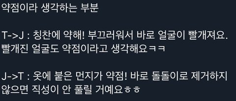 상대 약점 묻는 질문에 이런 깜찍한 대답을 하냐......둘 다 진심이었을 것 같아서 더 귀여움