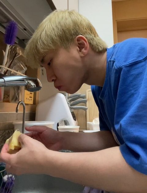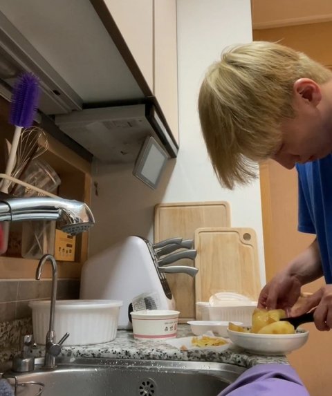싱크대에서 복숭아 깎는 남편