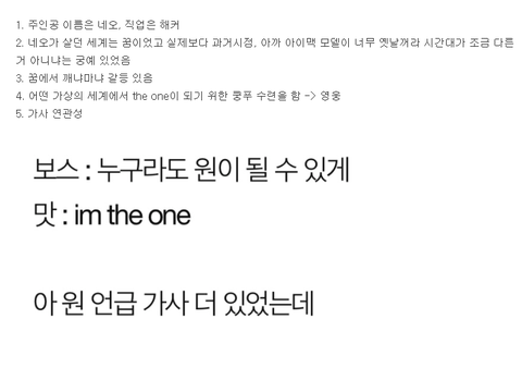 이거 말고 레귤러에서도 우린 원을 쫓지 않아 be the one one one 이러잖음... 생각해보니까 꿈 말고도 one도 많이 나왔네 ;;;