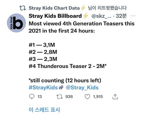 4세대 아이돌 중에서 24시간동안 티저 조회수 순위인데 스키즈가 4위야! 근데 심지어 아직 12시간 남았어 1위 한 번 해보장❤️