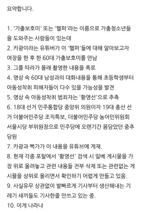 카광 채널에 올라온 영상인데 이 영상이 뭐냐면 카광이 가출청소년으로 위장하고 성범죄 저지르는 사람들 찾는? 그런건데 여기에 민주당 전 의원이란 사람이 나와서 ㅋㅋㅋㅋㅋ미성년자한테 성범죄 저지를 얘기 서슴없이 하고 ( 너무 수위가 쎄서 카광도 음소거 처리 할 정도) 집에 데려가서 술이랍시고 이상한 음료수 먹게 강요하고ㅋㅋㅋㅋㅋㅋ 더 웃긴게 집에 민주당 관련 표창장같은걸 보란듯이 펼쳐놓음 ㅋㅋㅋㅋㅋㅋ 근데도 황xx의원이라는데 기사 하나 안나오고 뉴스하나 안 나와 지금 ㅠㅠㅠ 우리라도 관심을 가져야해 ㄹㅇ 나라꼴이 이게 뭐야
