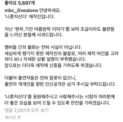 근데 그래도 방송 말미에 사과문이라도 띄워줬어야 하는 거 아님?? 그냥 아무 일 없었던 것처럼 게스트 나오고 하는 건 아니라고 봄 예전 전현무 한혜진 열애설 때도 부랴부랴 추가분 녹화해서 올리고 박나래 ㅅㅎㄹ 논란때는 그냥 한 에피소드를 통째로 그 얘기로 채우더니 이번엔 패널들도 자막도 언급 하나 없는게 ㅋㅋㅋㅋ 인스타에 저렇게 띡 올리는 걸로 마무리될 일이라고 생각하는건가??