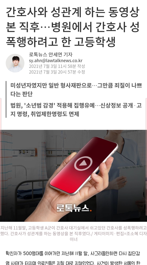 최근에 그 사건도 있었음 ㅇㄷ에서 간호사 보고 현실에서 간호사 성추행 하려 했던 미친 고등학생 ㅋㅋ