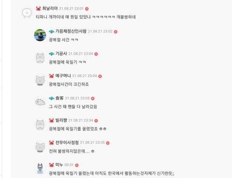 애초에 전범기 필터 만들어놓은 스냅챗에 항의한 사람은 아무도 없고 그저 연예인 까기만 바쁜 네티즌들 진심 미개함; 입으로만 애국타령임 ㅋㅋ 저거 다 남초같은데 저러고 진격의 거인 이딴 애니는 잘만 보겠지.. 고의도 아니고 그렇다고 티파니가 전범국 옹호를 한 것도 아니고 일빠도 아니고 본인의 무지함 사과하고 자숙에 역사 공부도 했다는 사람을 몇년간 저러고 욕하는 사람이 더 문제 아님?