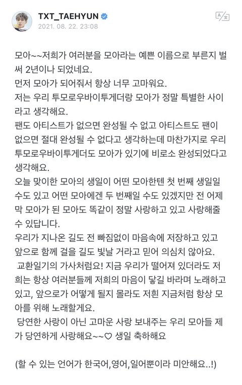 팬들이 보낸 편지읽은거 어느모아 이러면서 다 언급해주고하는거 보면서 투바투 태현이 더 많은 사람이 알았으면좋겠어서!