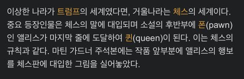 이상한 나라의 앨리스는 트럼프의 세계로 돌아가고, 거울나라는 체스의 세계로 돌아감