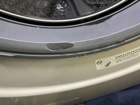 저희가 세탁조 안 깊숙이 넣지 않고 도어에 걸쳐넣은 후 그대로 닫으며 빨래가 안으로 빨려들어가며 찢어진 것이라고 말씀해주셨습니다.
