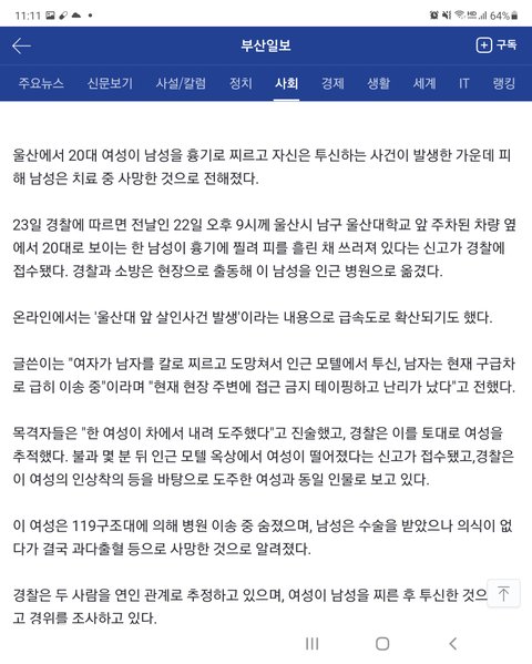 어제 남자가 애인 살해한 기사 가지고 와서 여혐사건 거리길래,
