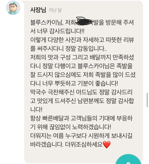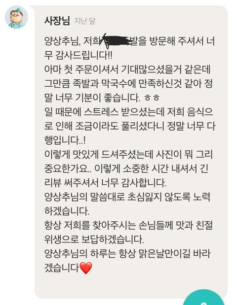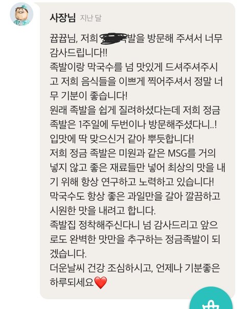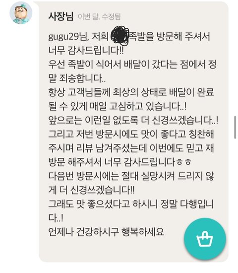 ㅋㅋㅋㅋ아니 여기 강일동에 있는 족발집인데 족발 먹을라고 배민들어갔는데 사장님인지 직원인진 모르겠는데 리뷰댓글 쓰시는게 거의 편지처럼 쓰시는거 보고 뭔가 훈훈해짐 80몇갠가 있는데 끝까지 다읽어봄 ㅋㅋㅋㅋ 시키고 리뷰써봐야지 괜히 따뜻해짐