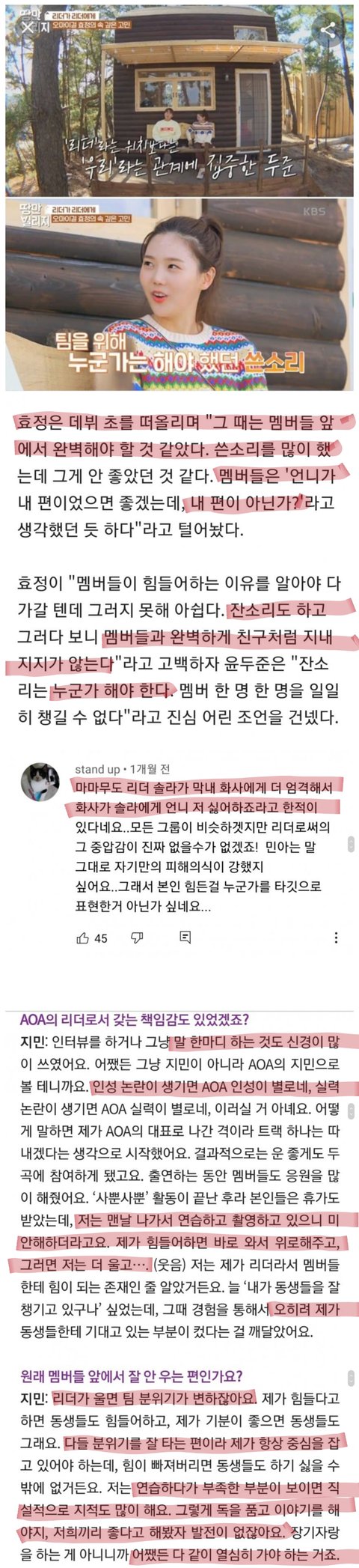 아이돌 리더들의 비슷한 고민(오마이걸 효정 하이라이트 윤두준 aoa 지민)