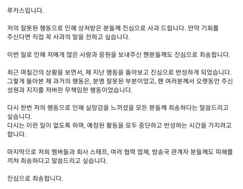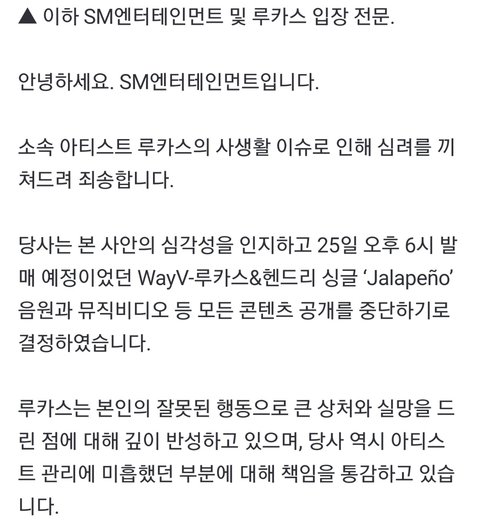 방금 올라온 루카스 사과문 루카스 황욱희 여친 바람 웨이션브이 샤오쥔 쿤 윈윈헨드리 양양 텐 사과문 SM 논란