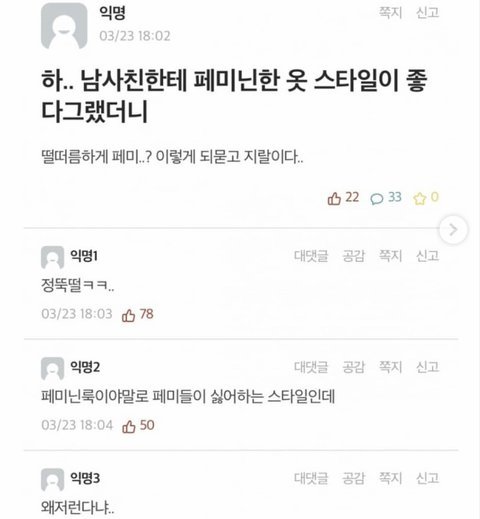근데 저런 진짜 머리 빈 애들말고도 페미? 난 페미니즘 자체는 나쁘지 않은데,, 우리나라 페미는 변질된것같아서 별루 ㅠㅠ 나 여대는 가기 싫어 거기 페미 많잖아ㅠㅜ 이런애들도 가끔 있는데... 얘네는 .. 걍 뭐 할 말이 없음 ... 여대가면 진짜로 다 페미만 있고 치마 입고 다니면 우르르 몰려와서 뭐라할거라고 생각함... 어디서 이상한거만 본것같음...그리고 높은 확률로 여대 가기 싫다는 본심은 연애하고 싶어서임 ~