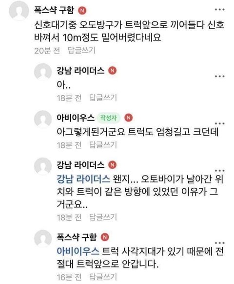 트럭운전사가 제일 ㅈ된거아닌가 아무리 그래도 내가 운전해서 사람이 즉었다는 정신적 데미지는 진짜.. 죄책감과 엄청난 무게감 압박이 올텐데. 신호위반하고 나쁜짓한 오토바이 운전자는 죽어서도 트럭 운전수에게 피해를 준다..
