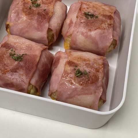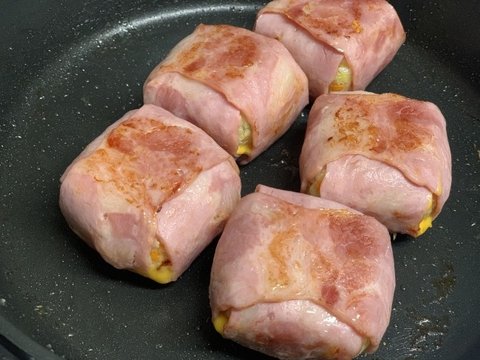 2. 슬라이스  치즈 올리고 베이컨으로 주먹밥을 감싸준 후