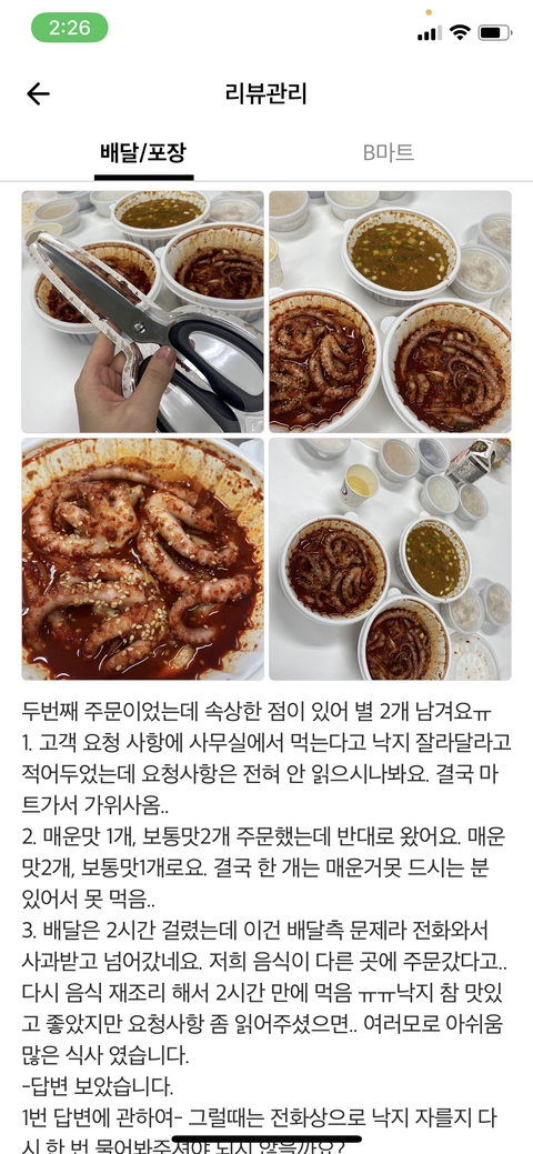 배송업체에게 사과받고 재 조리 하여 주문한지 2시간째에 배송받았습니다. (여기서 매운맛 1개, 보통맛 2개-> 매운맛 2개, 보통맛1개) 로 배송오고 2번째 주문에서도 낙지가 잘려있진 않았습니다.