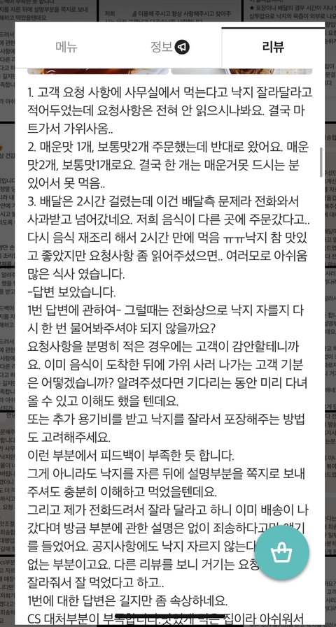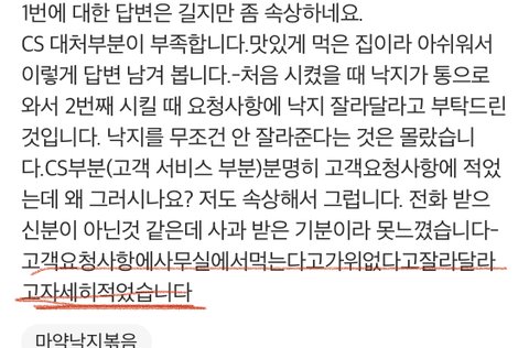 고객요청사항에 낙지 잘라 달라는 건