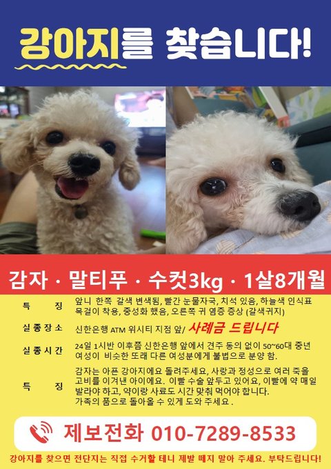 이런 비슷한 분이 한두분이 아니시겠지만, 일산에서 3kg 정도 되는 크림색 1살정도 된 강아지를 분양 받아 데려오신분을 찾습니다!!! 제 목숨보다 더 소중한 아이라 꼭 돌려주세요, 사례는 해드리겠습니다.