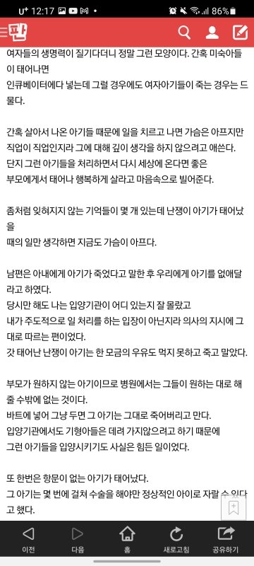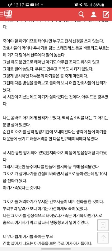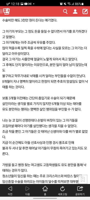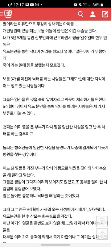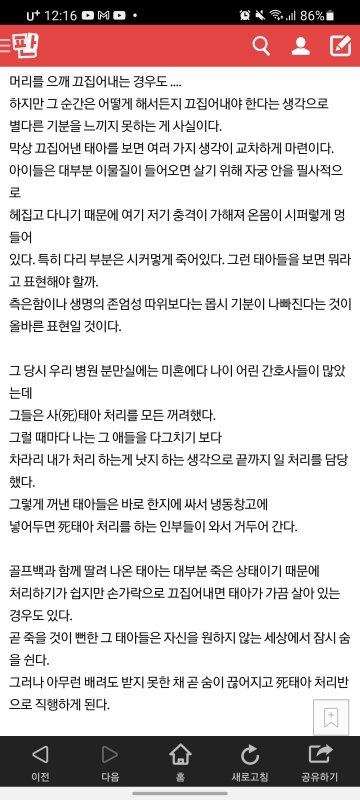 산부인과에서 근무하는 사람으로써 이글 너무 슬픕니다. 난임과에서는 애기 가져려고 울고불고 하고, 그 산과에서는 출산과 낙태늘 땔래야 땔수없는 존재이고ㅠㅠ 저도 일하면서 딜레마가 와요. 무엇을 위해 일해야하나. 왜 이 아이들은 그토록 원하는 사람들에게 가지못하고 이렇걱 죽어야하나..또는 너무 어린 소녀들이 사고쳐서 오면 그래 차라리 지우는게 낫지 하고..꼭 피임하시고 그것도 못했으면 사후피임약이라도 와서 타갔으면 그리고 어머님들 사후피임약 본인 허락없이 줬다고 산부인봐에 전화해서 난리난리치는데 배불러서 오는것보다 낫습니다.
