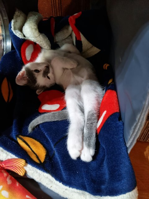 저 무지개 이불이 좋은지 잘 누워 있고 잠도 잘 잔다