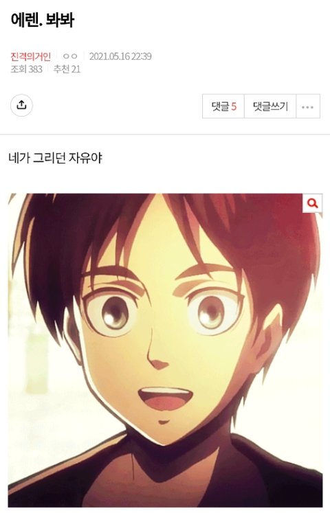 어릴 때부터 자신의 손에 인류의 존망이 달려 있다는 말을 들었으니 얼마나 부담이 됐겠어.. 엄마도 눈 앞에서 잃었는데 그 상처가 아물기도 전에 '진격의 거인'이라는 엄청난 파도가 상처를 덮어버려서 상처가 낫지 못 하고 그 속에서 곪았을 것 같아. 그래서 어쩌면 에렌 스스로도 자신이 지금 힘든 상태라는 걸 인지도 못 하고 부담과 죄책감 속에서 살았겠지.. 이젠 뗄레야 뗄 수 없는 진격의 거인에 대한 마지막 반항이 '자유'였던 것 같아