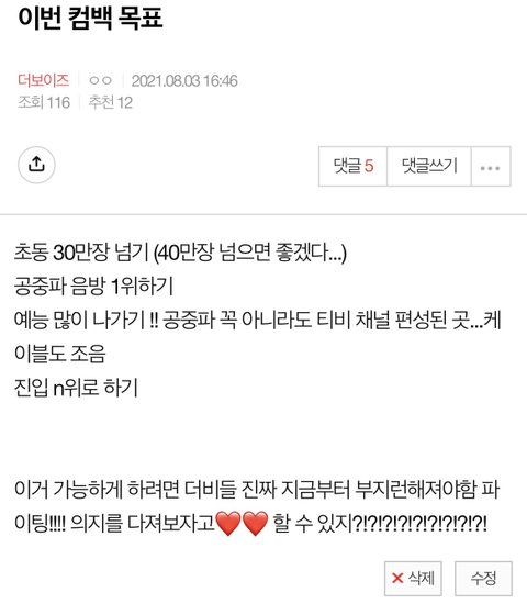 나 컴백전에 팬톡에 이 글 썼었거든.. 솔직히 쓰면서 목표니까 일단 높게 잡아보자 한거지 이걸 거의 다 이뤄낼거라는건 생각지도 못했는데..