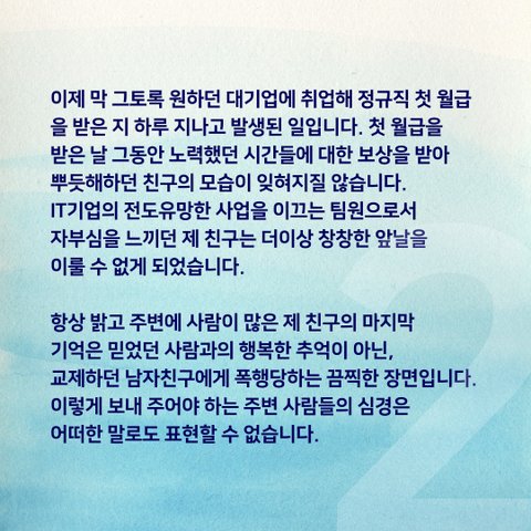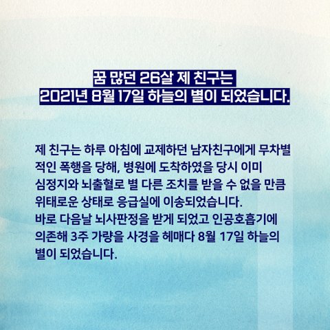 이제 막 그토록 원하던 대기업에 취업하여 미래가 창창한 예진이가 남자친구 하나 잘못 만난 이유로 심정지 상태로 응급실에 이송되고, 인공호흡기로 하루하루를 버티다 세상을 떠나게 되었습니다. 이제 더 이상 함께 웃고 떠들수 없게 된 예진이가 너무나도 안쓰럽습니다.