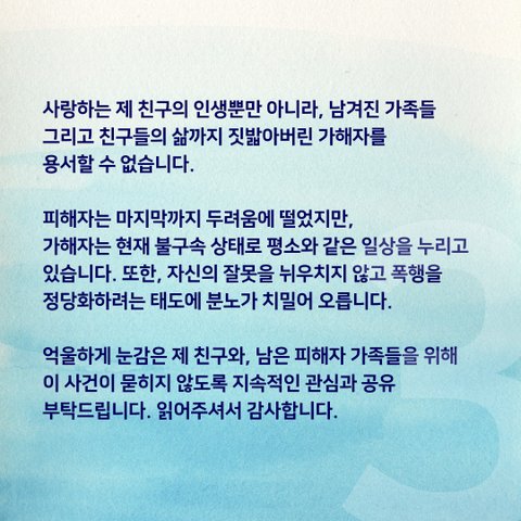 마지막 한 마디 조차 나눠보지 못하고 세상을 떠나게 된 친구의 억울함을 덜어주시길 바랍니다.