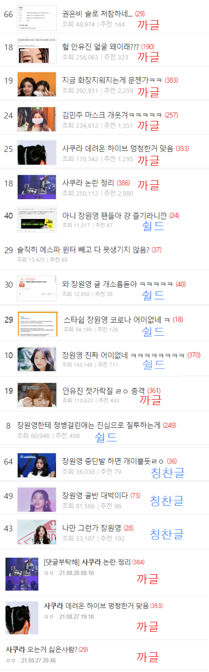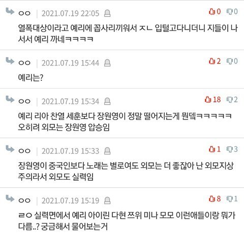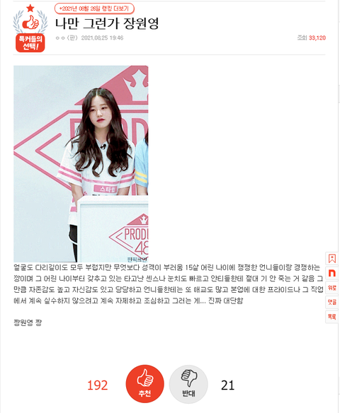 장원영은 칭찬글 많고 까글 올라와도 열폭 여적여라며 먹금 쉴드 잘되고