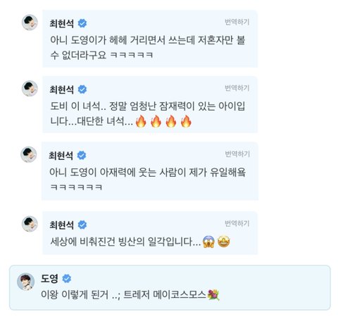 저거 쓰면서 헤헤 웃는 도영이나 그걸 캐치하고 트메한테 보여준다고 찍어서 올린 현석이나 둘 다 귀여워 미치겠다❤️
