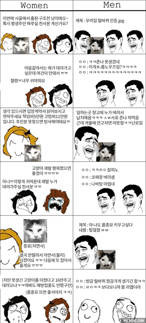 재미도없고 감동도없고... 실제로 유기묘 구조 임보하시는분들 여자분들이 훨씬 많은데 이런 짤 만드는 의도는? 남자들 그렇게 자기 모에화가 하고싶나?
