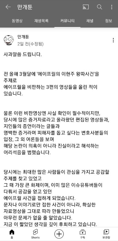 논란있는 사람들 만화로 그려서 비난하는 사람인데 예전에 에이프릴 만화 그려서 에이프릴 욕 엄청 먹었는데 잘못된거 정정하는 정황이 하나씩 드러나니까 영상삭제하고 사과문올림 ㅂㅅ